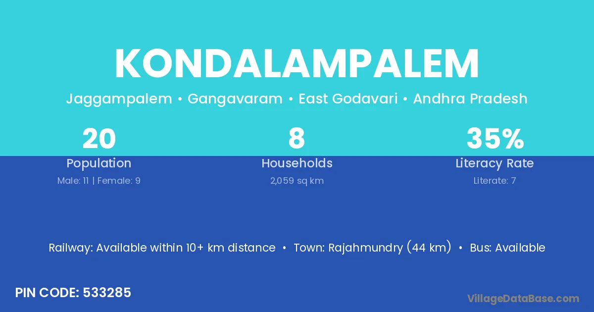 Rajahmundry (44 km) is the nearest town to Kondalampalem village for major economic activities and is located approximately 44 km away.