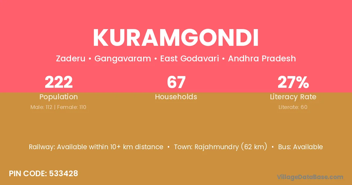 Rajahmundry (62 km) is the nearest town to Kuramgondi village for major economic activities and is located approximately 62 km away.