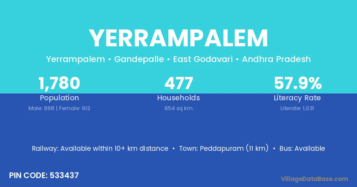Rajahmundry (52 km) is the nearest town to Yerrampalem village for major economic activities and is located approximately 52 km away.