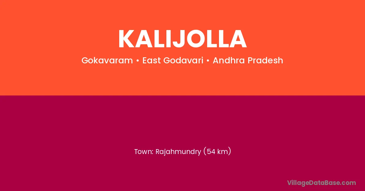 Rajahmundry (54 km) is the nearest town to Kalijolla village for major economic activities and is located approximately 54 km away.