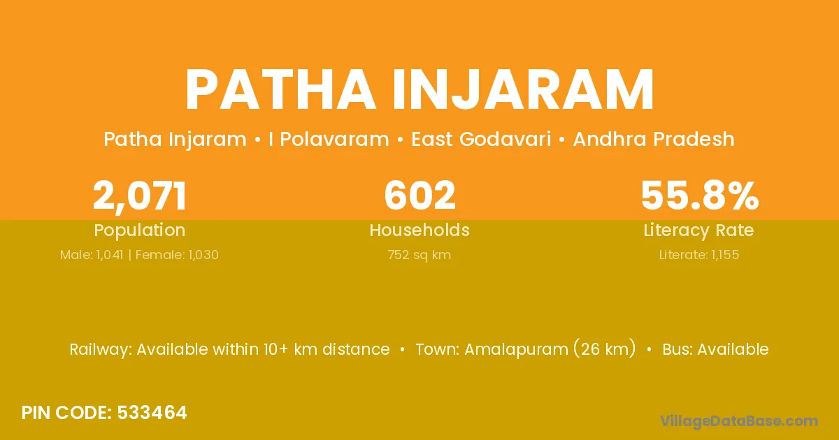 Amalapuram (26 km) is the nearest town to Patha Injaram village for major economic activities and is located approximately 26 km away.