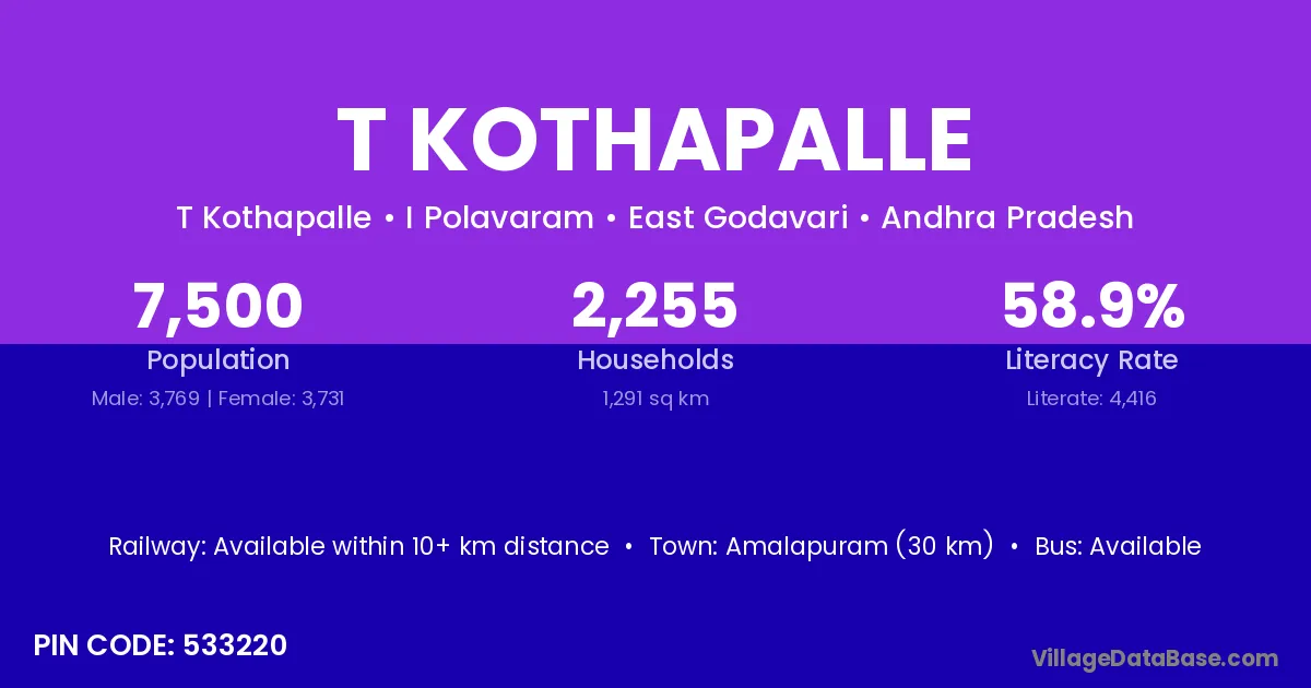 Amalapuram (30 km) is the nearest town to T Kothapalle village for major economic activities and is located approximately 30 km away.