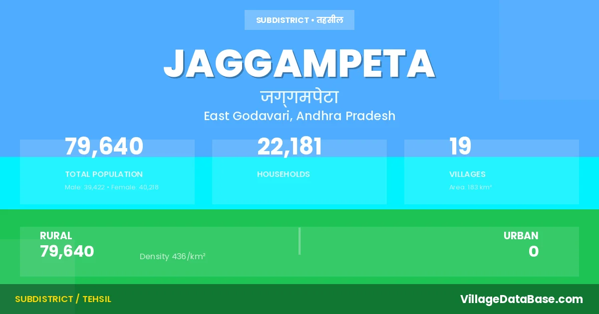 According to the 2011 census The total area of Jaggampeta Mandal is 183 km², with a population of 79640 people. The population density is 436 inhabitants per square kilometre, and there are approximately 22181 houses in the sub district.