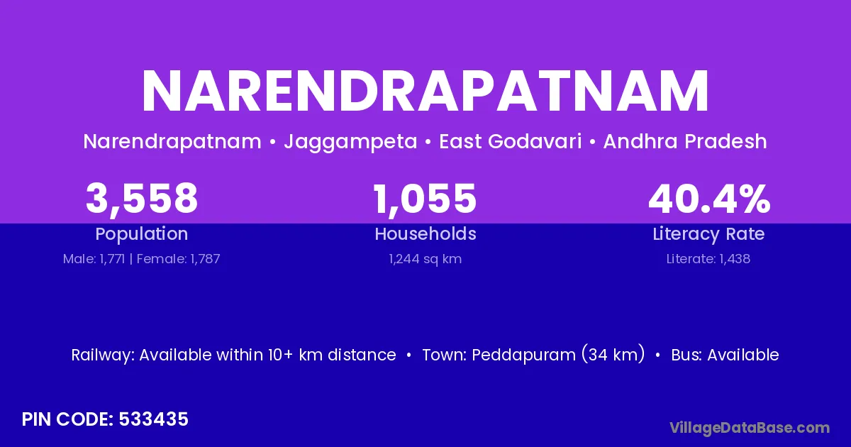 Peddapuram (34 km) is the nearest town to Narendrapatnam village for major economic activities and is located approximately 34 km away.