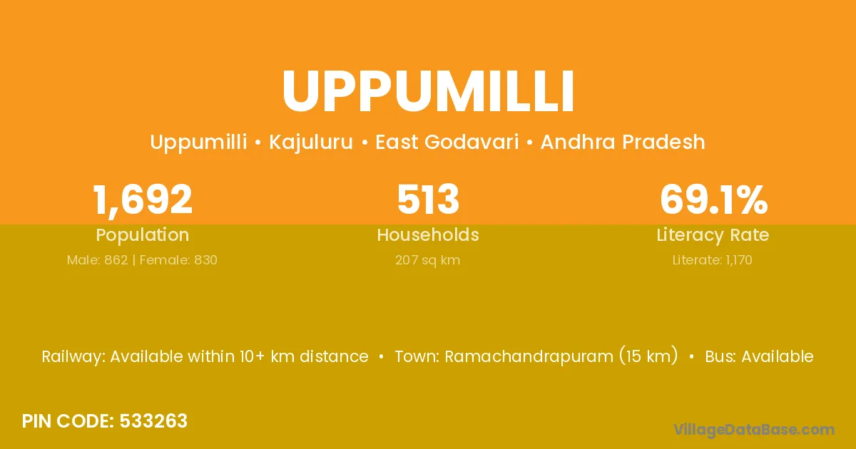 Ramachandrapuram (15 km) is the nearest town to Uppumilli village for major economic activities and is located approximately 15 km away.