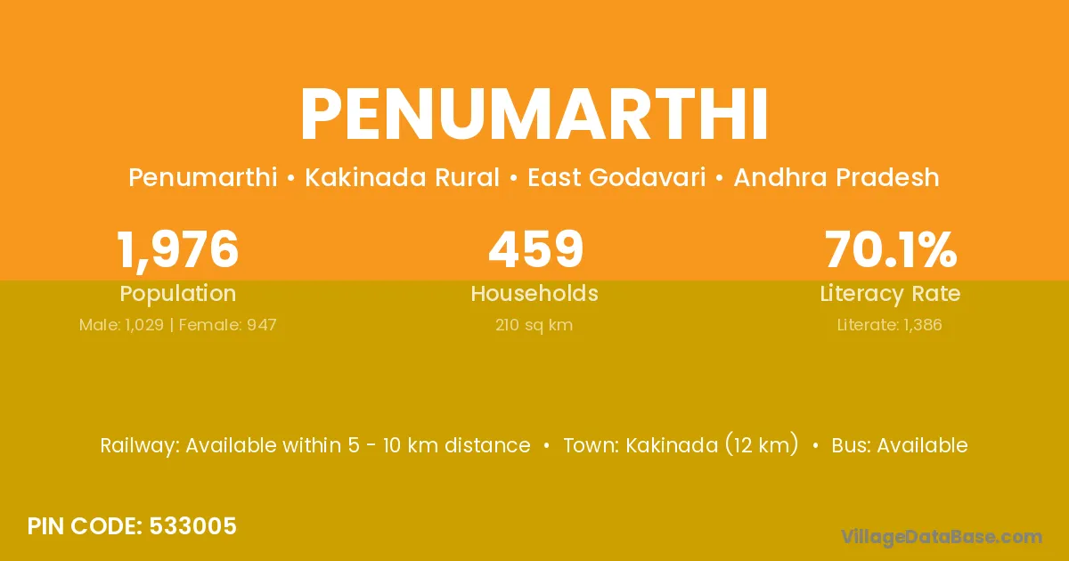 Kakinada (12 km) is the nearest town to Penumarthi village for major economic activities and is located approximately 12 km away.