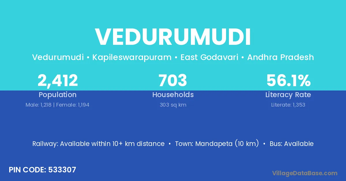 Mandapeta (10 km) is the nearest town to Vedurumudi village for major economic activities and is located approximately 10 km away.