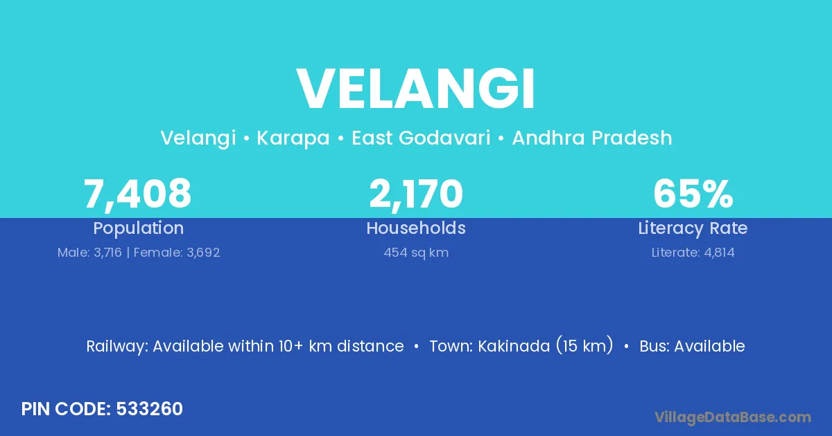 Kakinada (15 km) is the nearest town to Velangi village for major economic activities and is located approximately 15 km away.