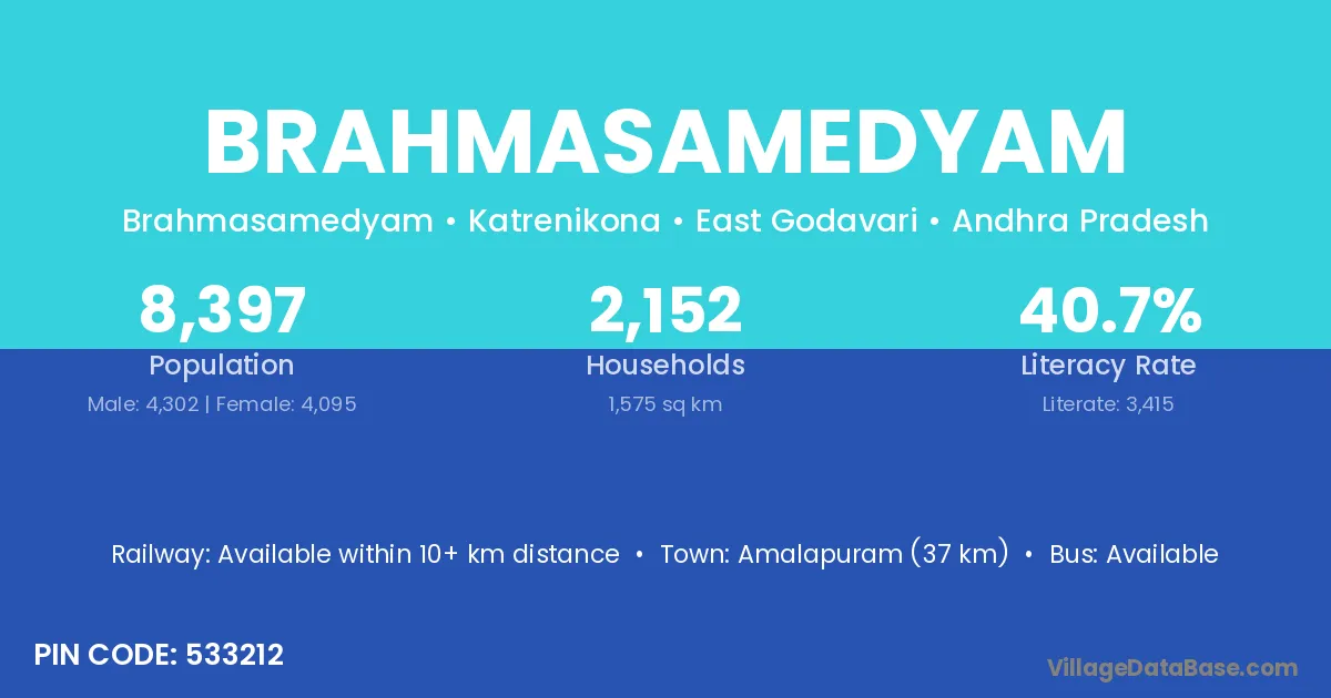 Amalapuram (37 km) is the nearest town to Brahmasamedyam village for major economic activities and is located approximately 37 km away.