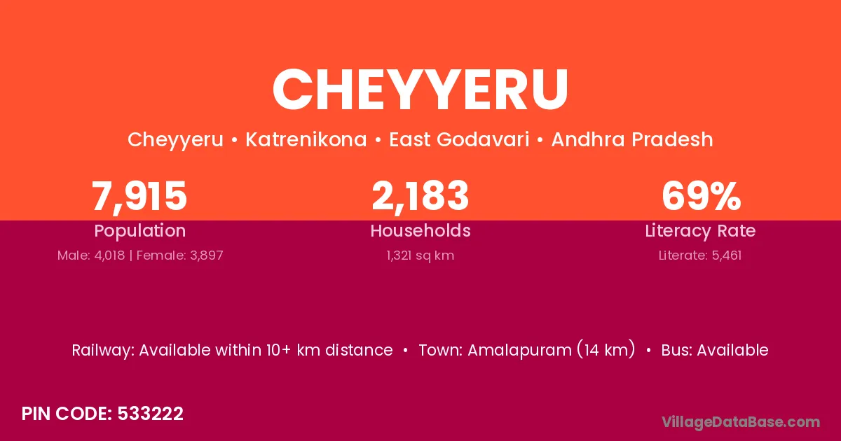 Amalapuram (14 km) is the nearest town to Cheyyeru village for major economic activities and is located approximately 14 km away.
