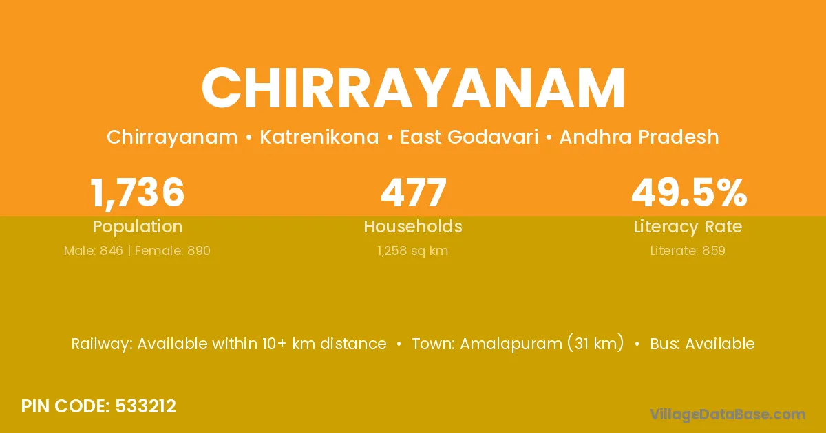 Amalapuram (31 km) is the nearest town to Chirrayanam village for major economic activities and is located approximately 31 km away.