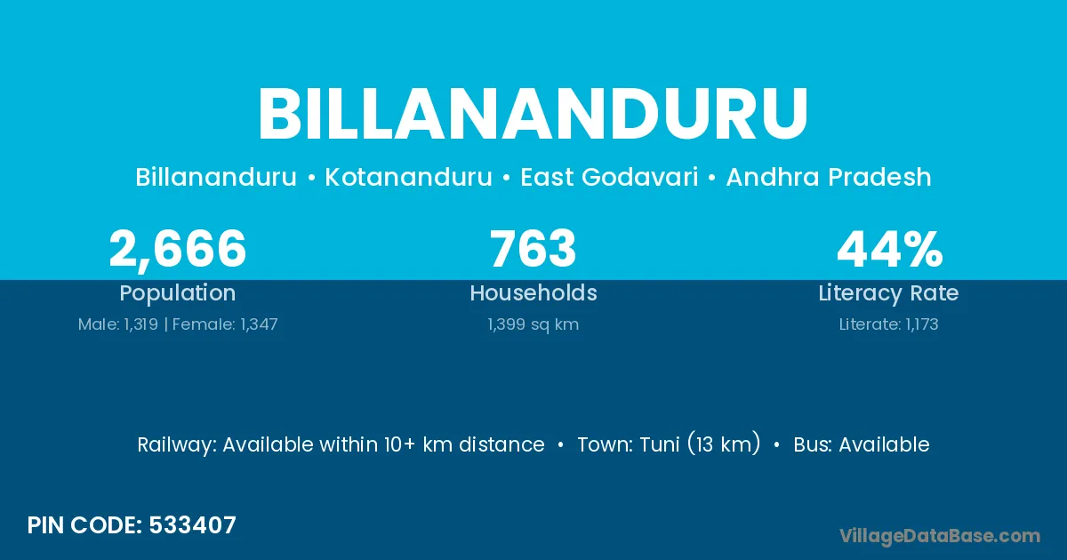 Tuni (13 km) is the nearest town to Billananduru village for major economic activities and is located approximately 13 km away.