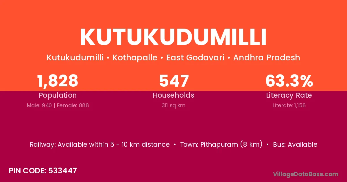 Pithapuram (8 km) is the nearest town to Kutukudumilli village for major economic activities and is located approximately 8 km away.