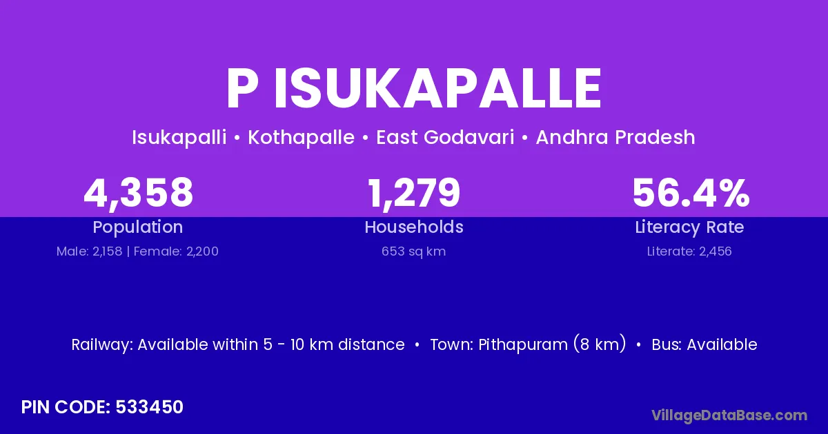 Pithapuram (8 km) is the nearest town to P Isukapalle village for major economic activities and is located approximately 8 km away.