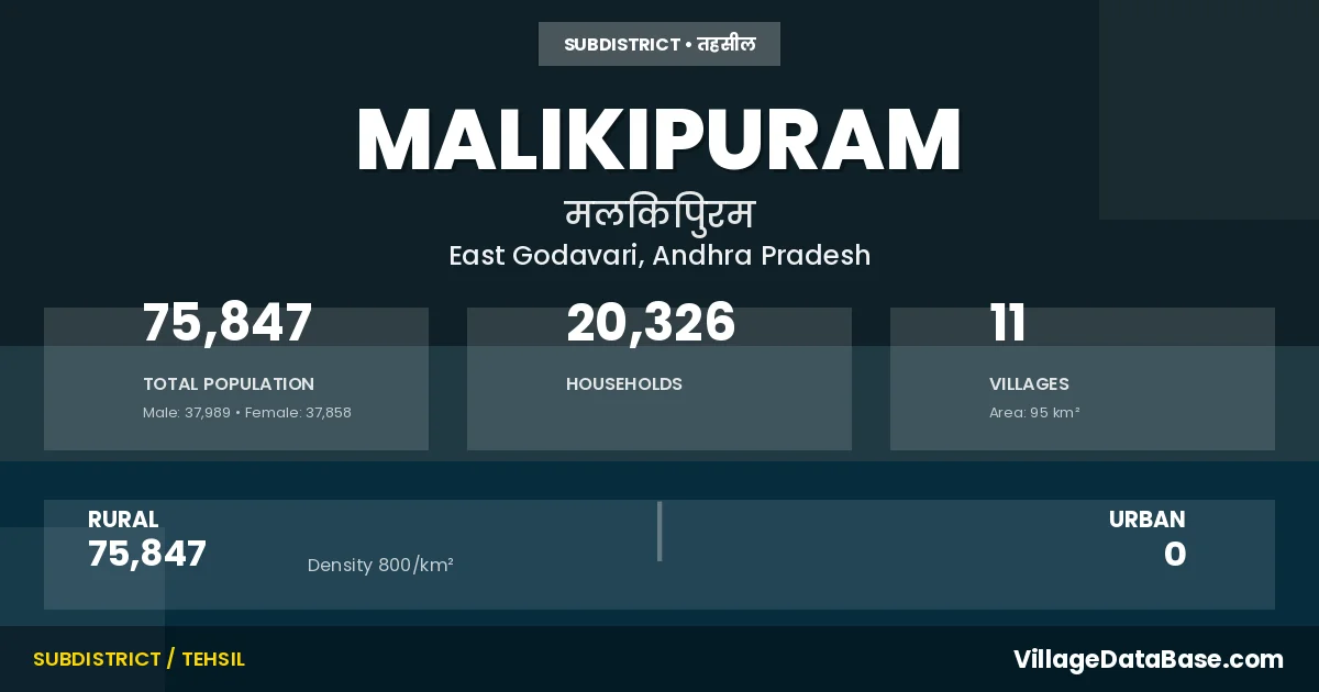 According to the 2011 census The total area of Malikipuram Mandal is 95 km², with a population of 75847 people. The population density is 800 inhabitants per square kilometre, and there are approximately 20326 houses in the sub district.