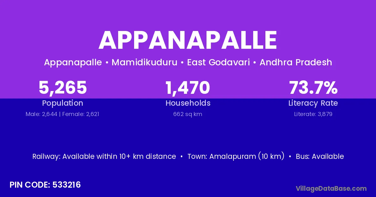 Amalapuram (10 km) is the nearest town to Appanapalle village for major economic activities and is located approximately 10 km away.