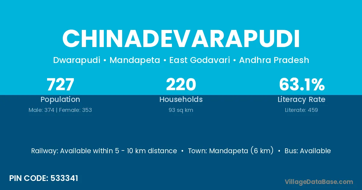 Mandapeta (6 km) is the nearest town to Chinadevarapudi village for major economic activities and is located approximately 6 km away.