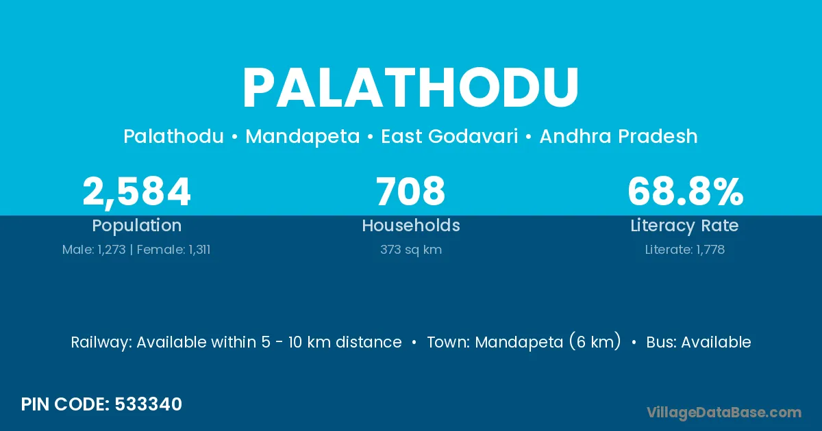 Mandapeta (6 km) is the nearest town to Palathodu village for major economic activities and is located approximately 6 km away.