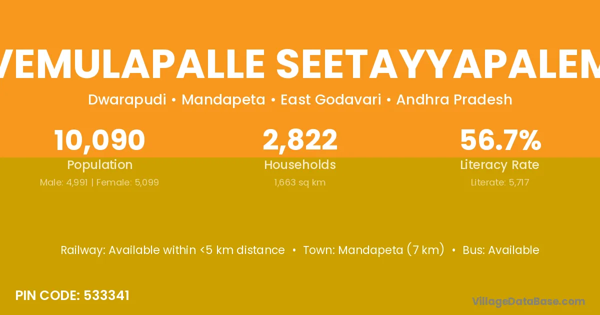 Mandapeta (7 km) is the nearest town to Vemulapalle Seetayyapalem village for major economic activities and is located approximately 7 km away.