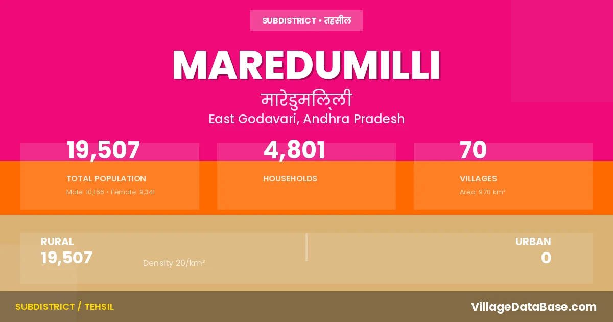 According to the 2011 census The total area of Maredumilli Mandal is 970 km², with a population of 19507 people. The population density is 20 inhabitants per square kilometre, and there are approximately 4801 houses in the sub district.