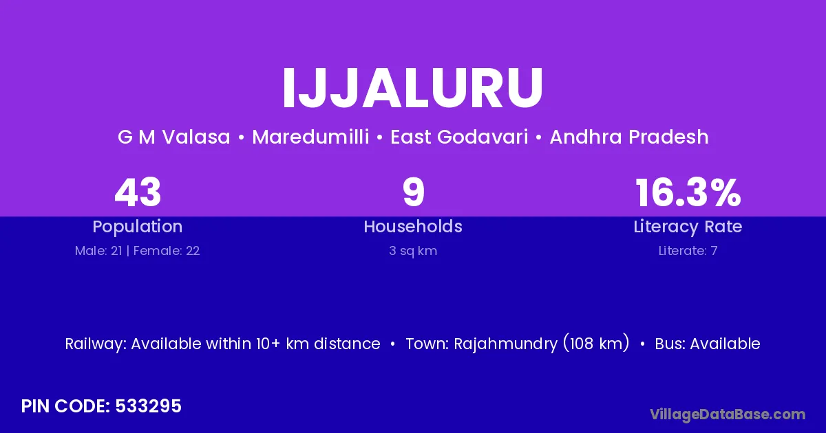 Ijjaluru village has a total population of 43 people, of which 21 are males and 22 are females.