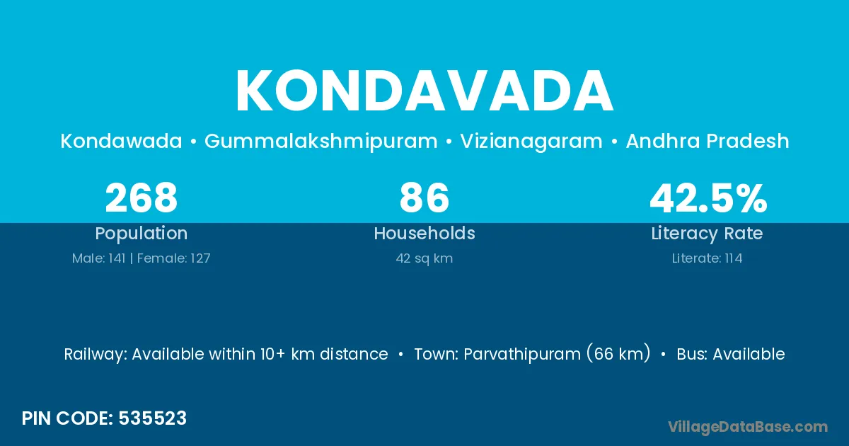 The literacy rate of Kondavada village is 19.23%. Male literacy stands at 36.36% and female literacy at 6.67%.