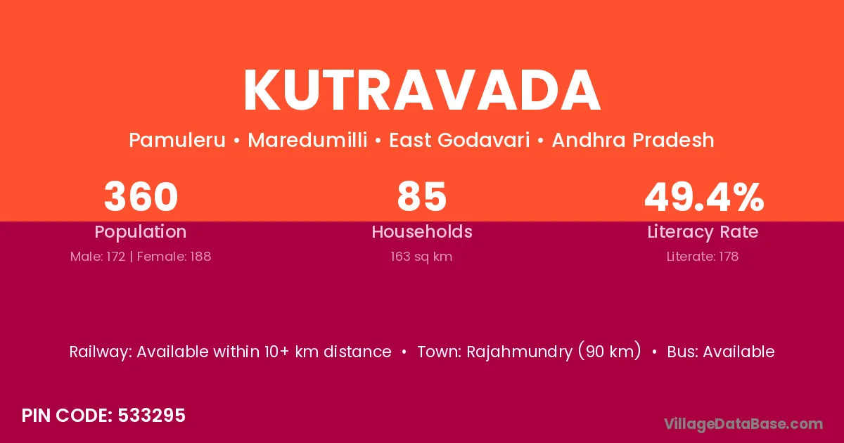 Kutravada village has a total population of 360 people, of which 172 are males and 188 are females.