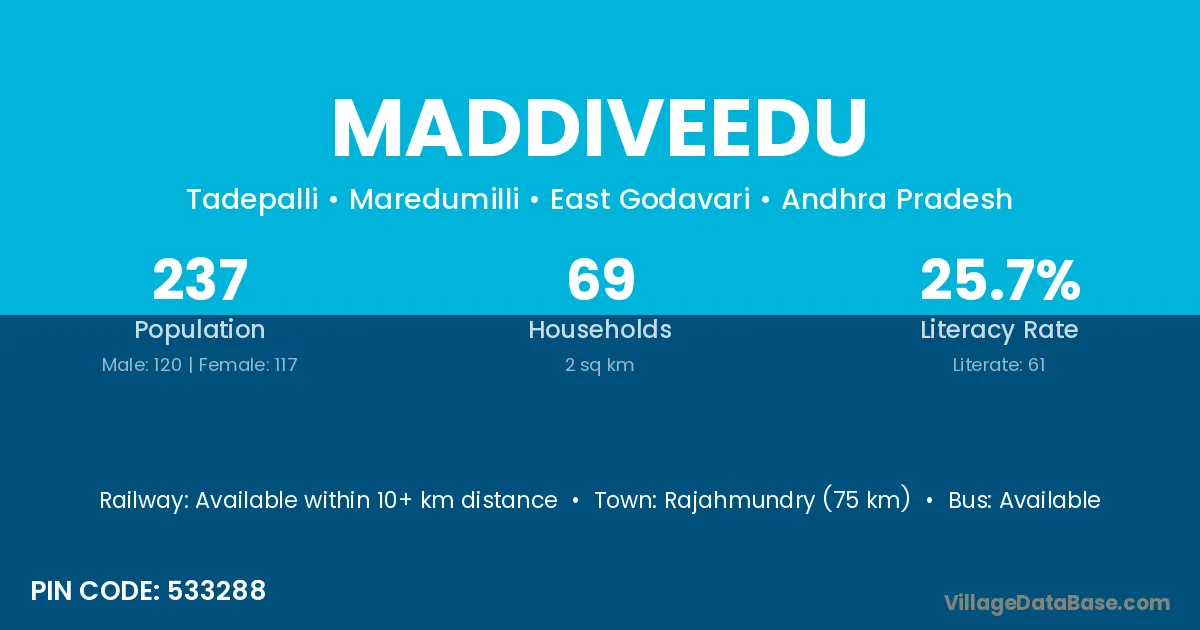 According to Census 2011 information, the village code of Maddiveedu village is 533288.