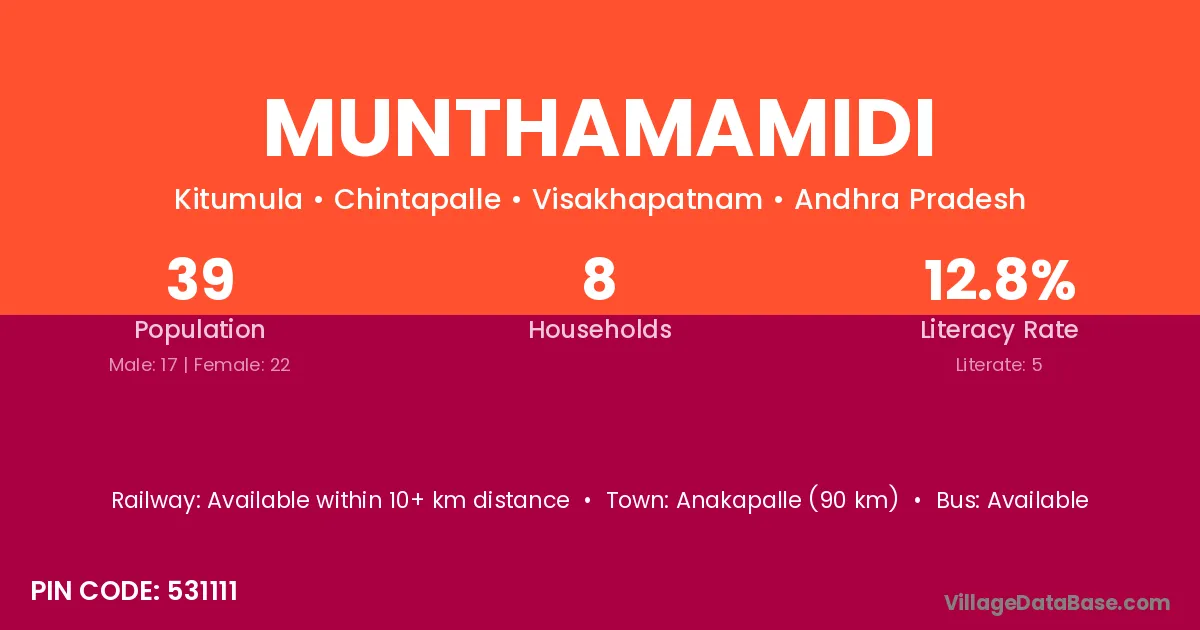 The literacy rate of Munthamamidi village is 40.07%. Male literacy stands at 48.87% and female literacy at 32.47%.