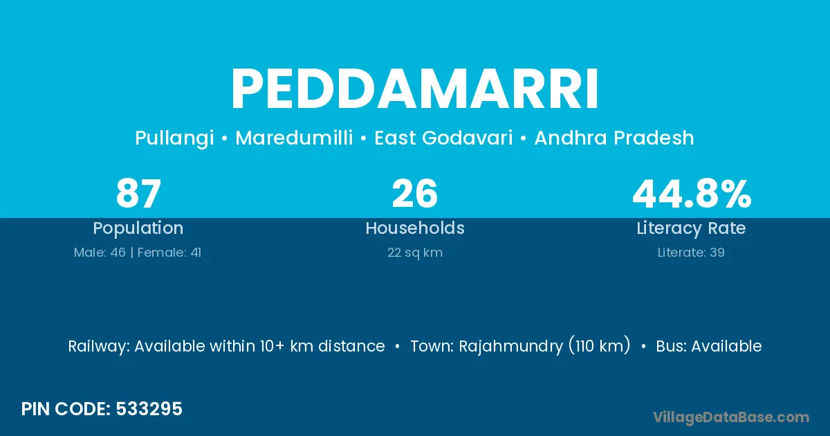 Rajahmundry (110 km) is the nearest town to Peddamarri village for major economic activities and is located approximately 110 km away.