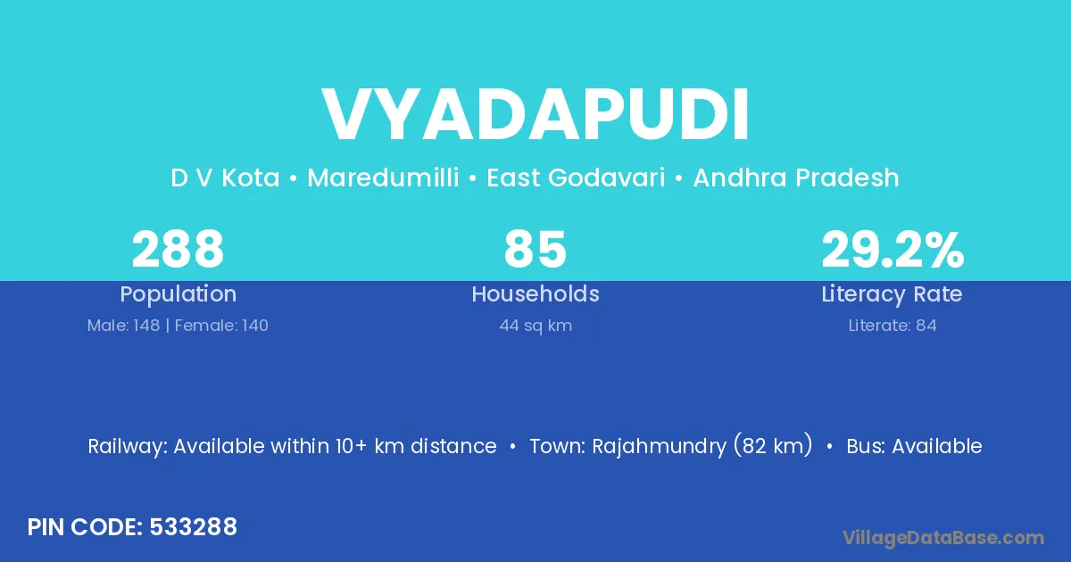 Vyadapudi village has a total population of 288 people, of which 148 are males and 140 are females.