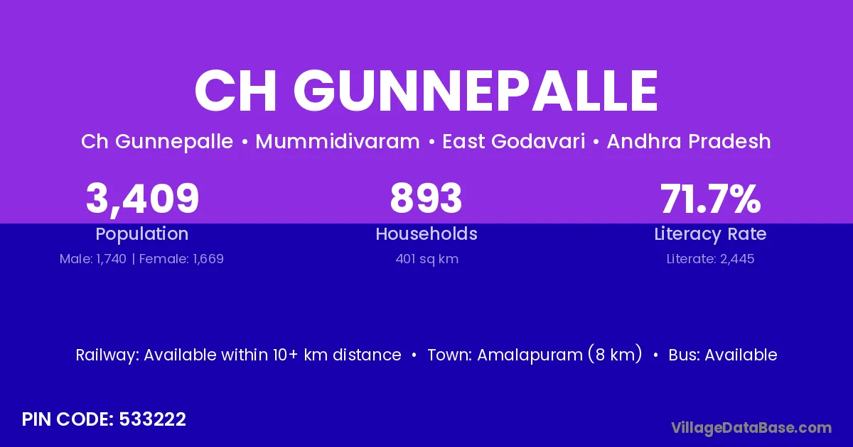 Amalapuram (8 km) is the nearest town to Ch Gunnepalle village for major economic activities and is located approximately 8 km away.