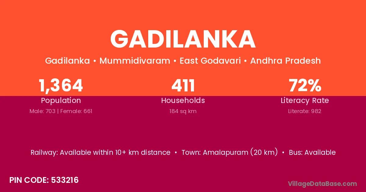 Amalapuram (20 km) is the nearest town to Gadilanka village for major economic activities and is located approximately 20 km away.