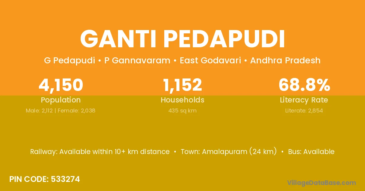 Ganti Pedapudi village has a total population of 4,150 people, of which 2,112 are males and 2,038 are females.