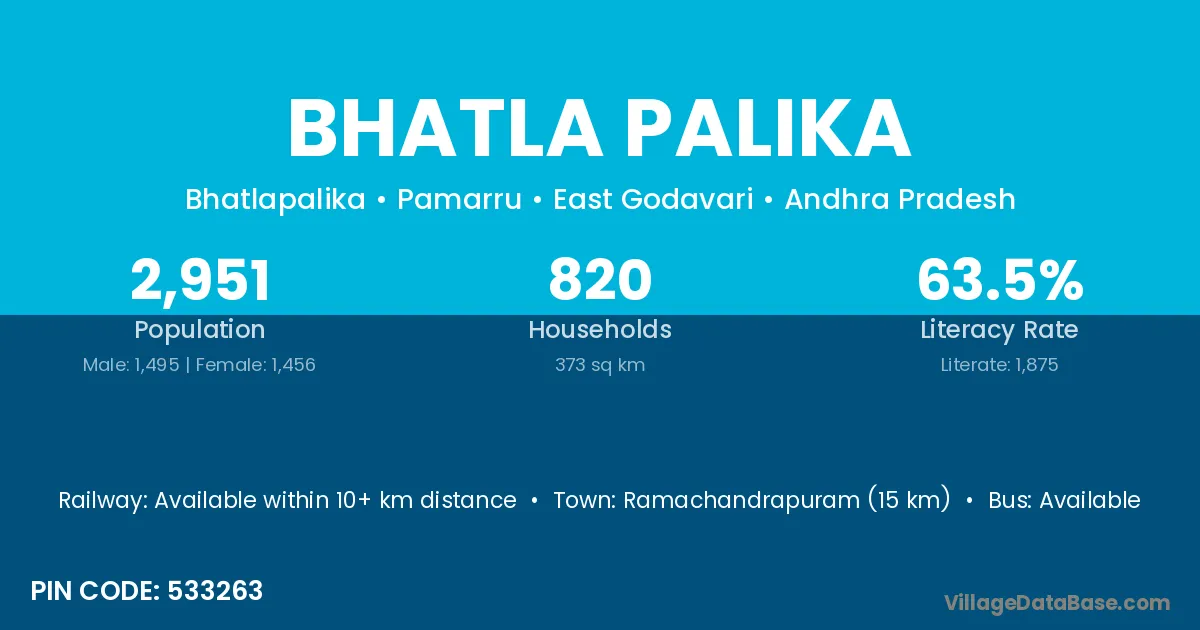 Ramachandrapuram (15 km) is the nearest town to Bhatla Palika village for major economic activities and is located approximately 15 km away.