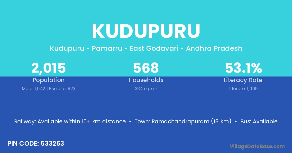Ramachandrapuram (18 km) is the nearest town to Kudupuru village for major economic activities and is located approximately 18 km away.