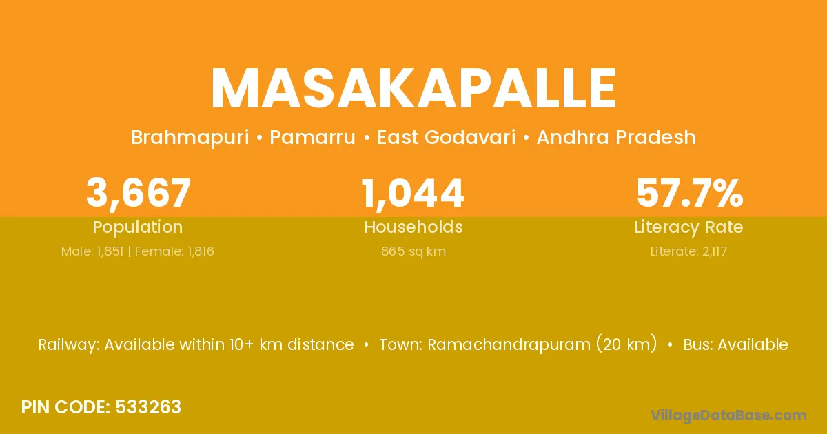 Masakapalle village has a total population of 3,667 people, of which 1,851 are males and 1,816 are females.