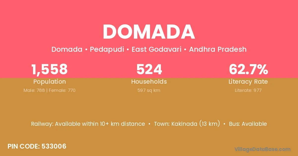 Kakinada (13 km) is the nearest town to Domada village for major economic activities and is located approximately 13 km away.