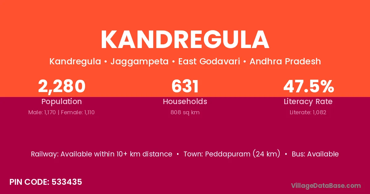 Kakinada (11 km) is the nearest town to Kandregula village for major economic activities and is located approximately 11 km away.