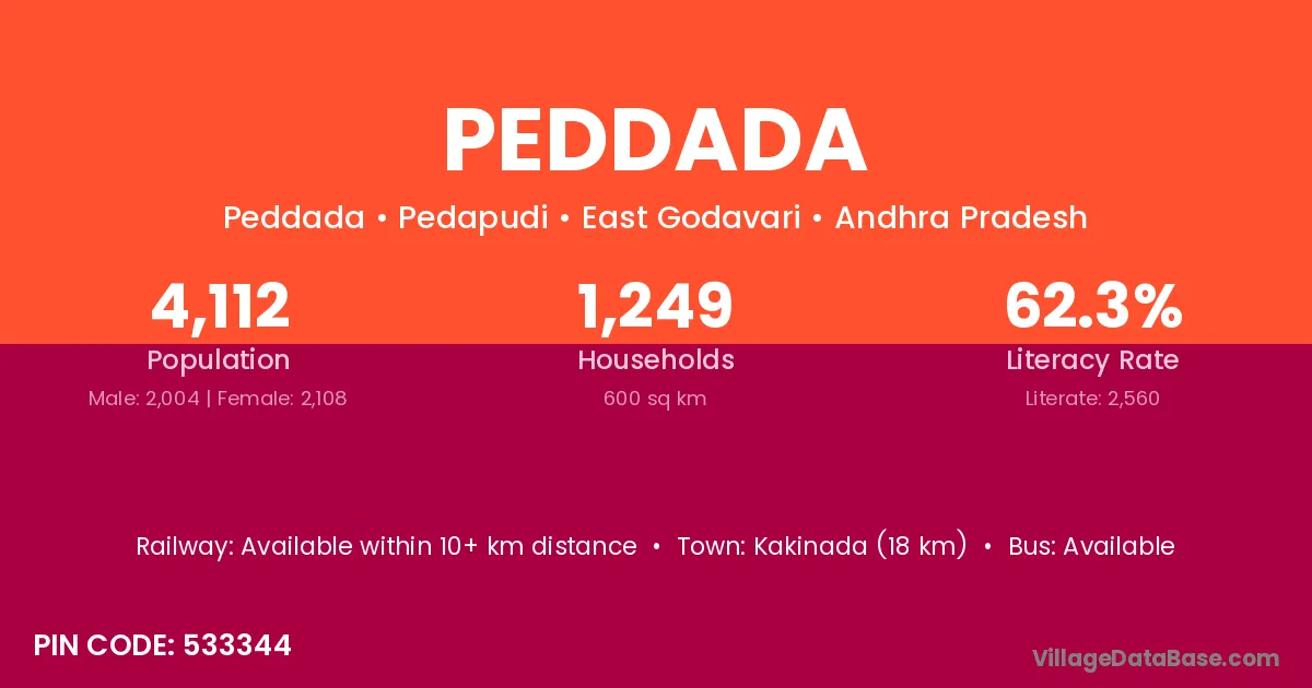Kakinada (18 km) is the nearest town to Peddada village for major economic activities and is located approximately 18 km away.