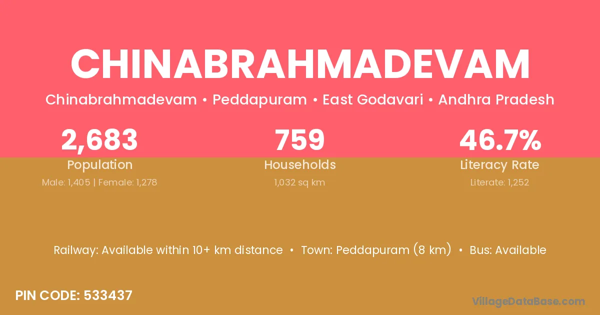 Chinabrahmadevam village has a total population of 2,683 people, of which 1,405 are males and 1,278 are females.