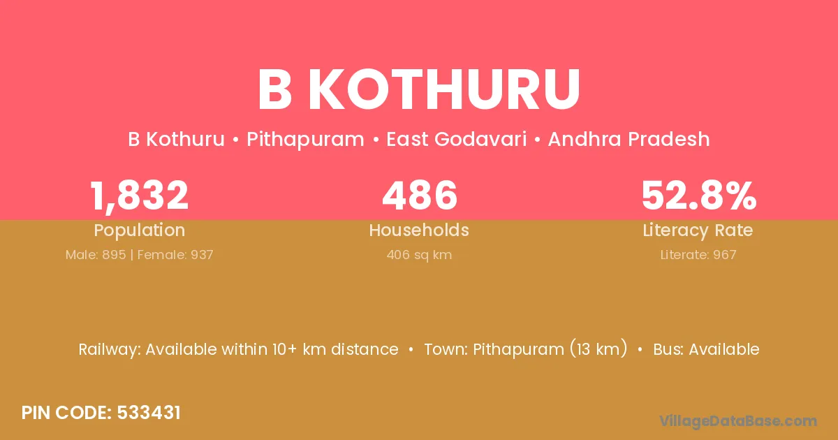 Pithapuram (13 km) is the nearest town to B Kothuru village for major economic activities and is located approximately 13 km away.