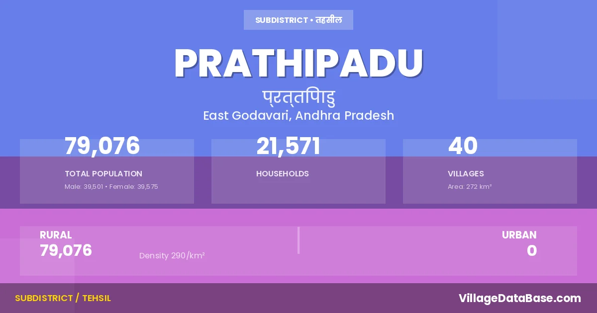 According to the 2011 census The total area of Prathipadu Mandal is 272 km², with a population of 79076 people. The population density is 290 inhabitants per square kilometre, and there are approximately 21571 houses in the sub district.
