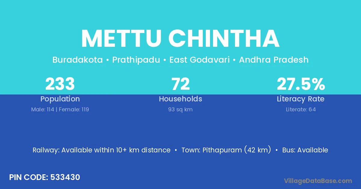 Mettu Chintha village has a total population of 233 people, of which 114 are males and 119 are females.