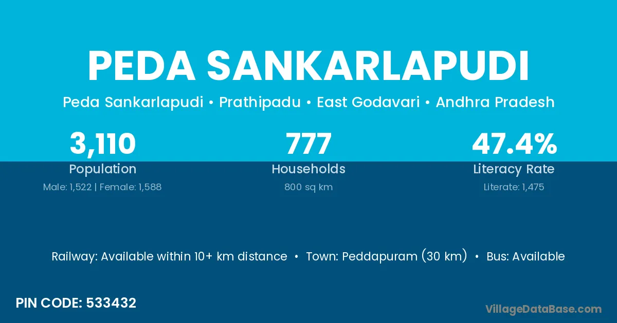 Peddapuram (30 km) is the nearest town to Peda Sankarlapudi village for major economic activities and is located approximately 30 km away.