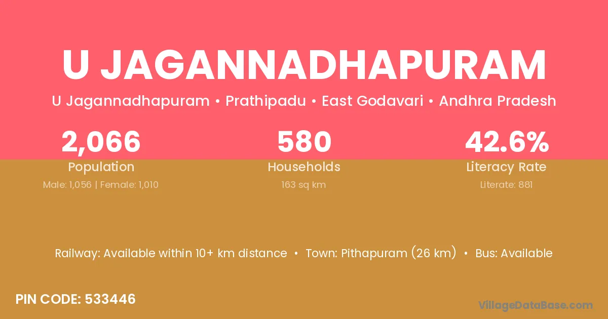 Pithapuram (26 km) is the nearest town to U Jagannadhapuram village for major economic activities and is located approximately 26 km away.