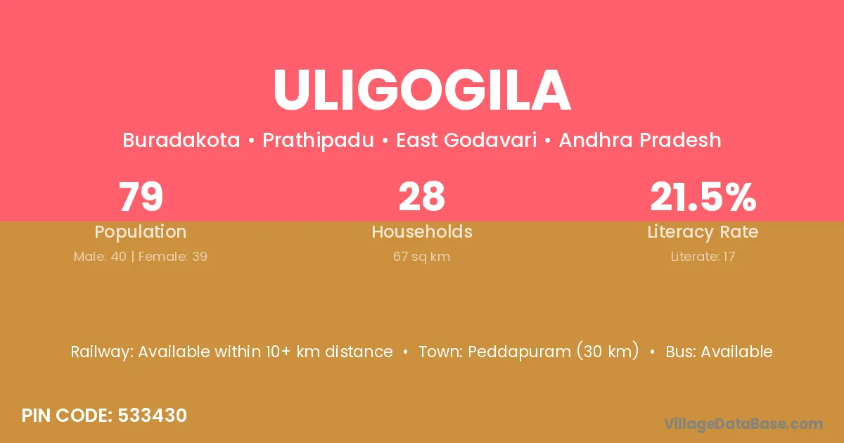 Uligogila village has a total population of 79 people, of which 40 are males and 39 are females.