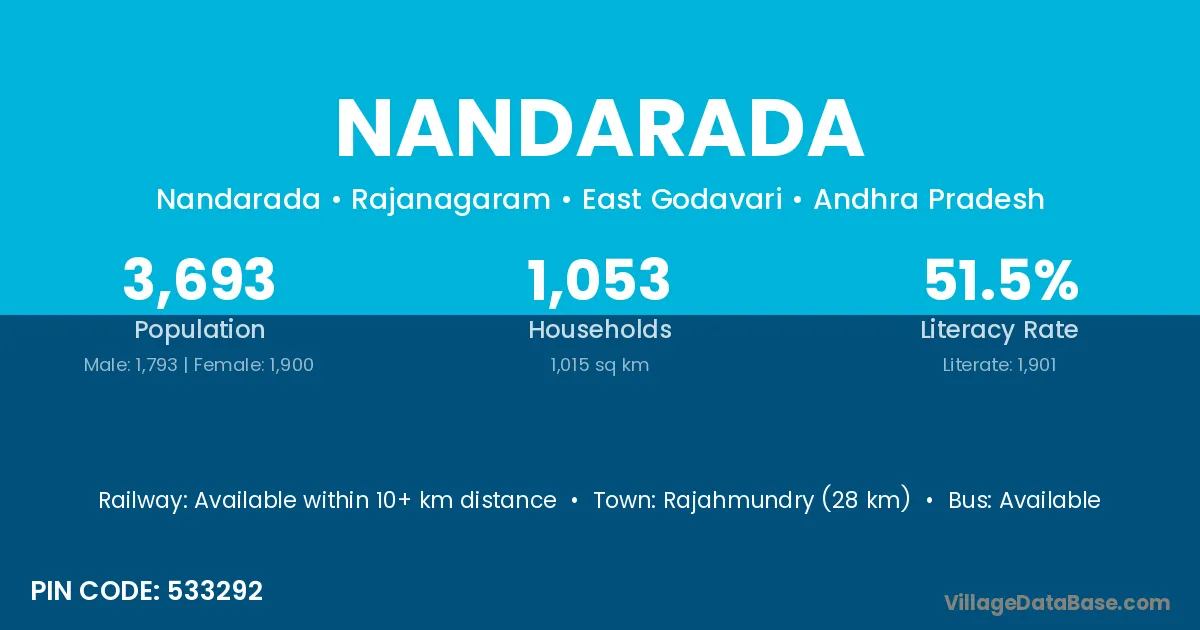 Rajahmundry (28 km) is the nearest town to Nandarada village for major economic activities and is located approximately 28 km away.