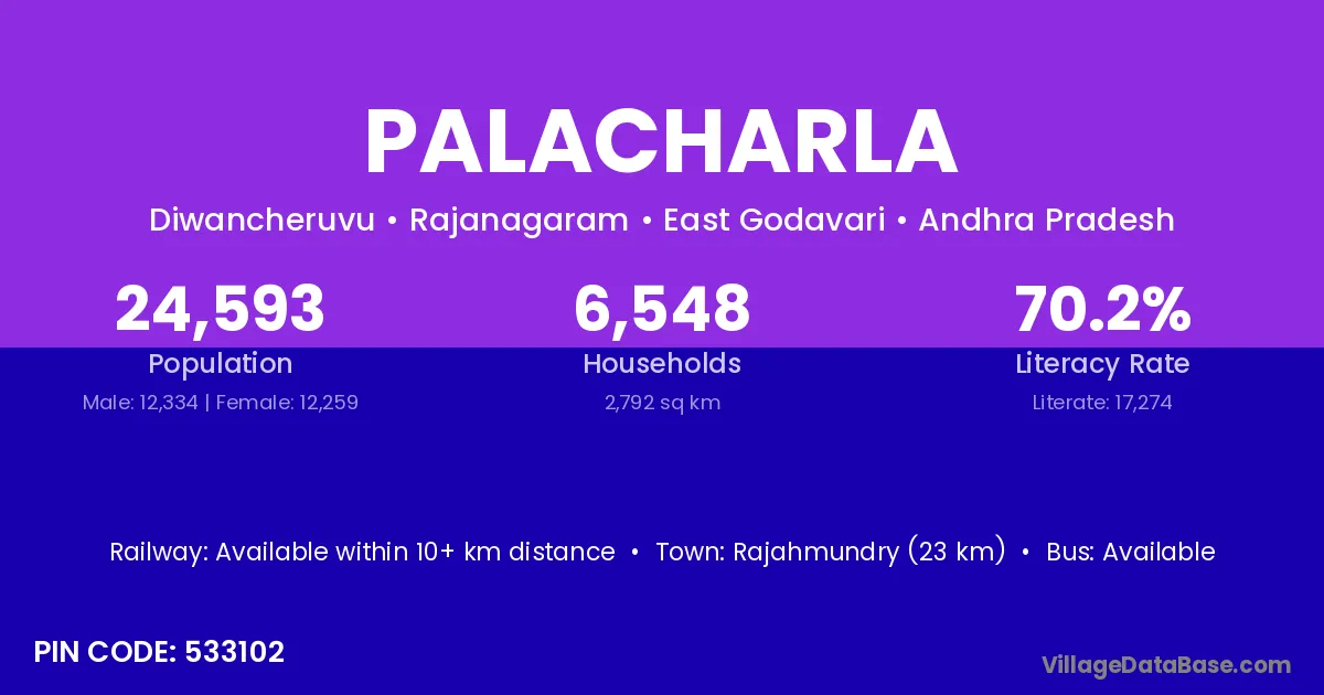 Rajahmundry (23 km) is the nearest town to Palacharla village for major economic activities and is located approximately 23 km away.