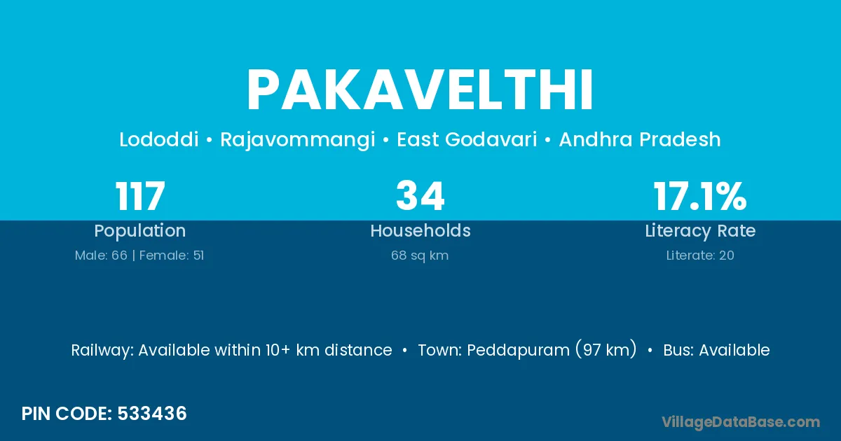 Pakavelthi village has a total population of 117 people, of which 66 are males and 51 are females.